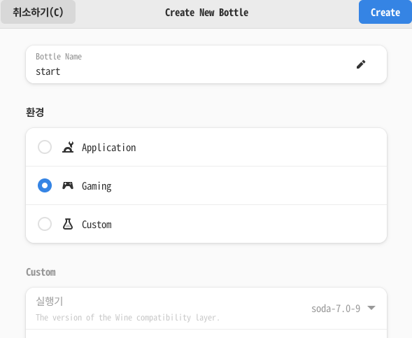 - 실행기 설정 - 저는 soda로 설정되어 있습니다. wine으로 변경하는 경우 fonts를 넣어도 안되더라구요